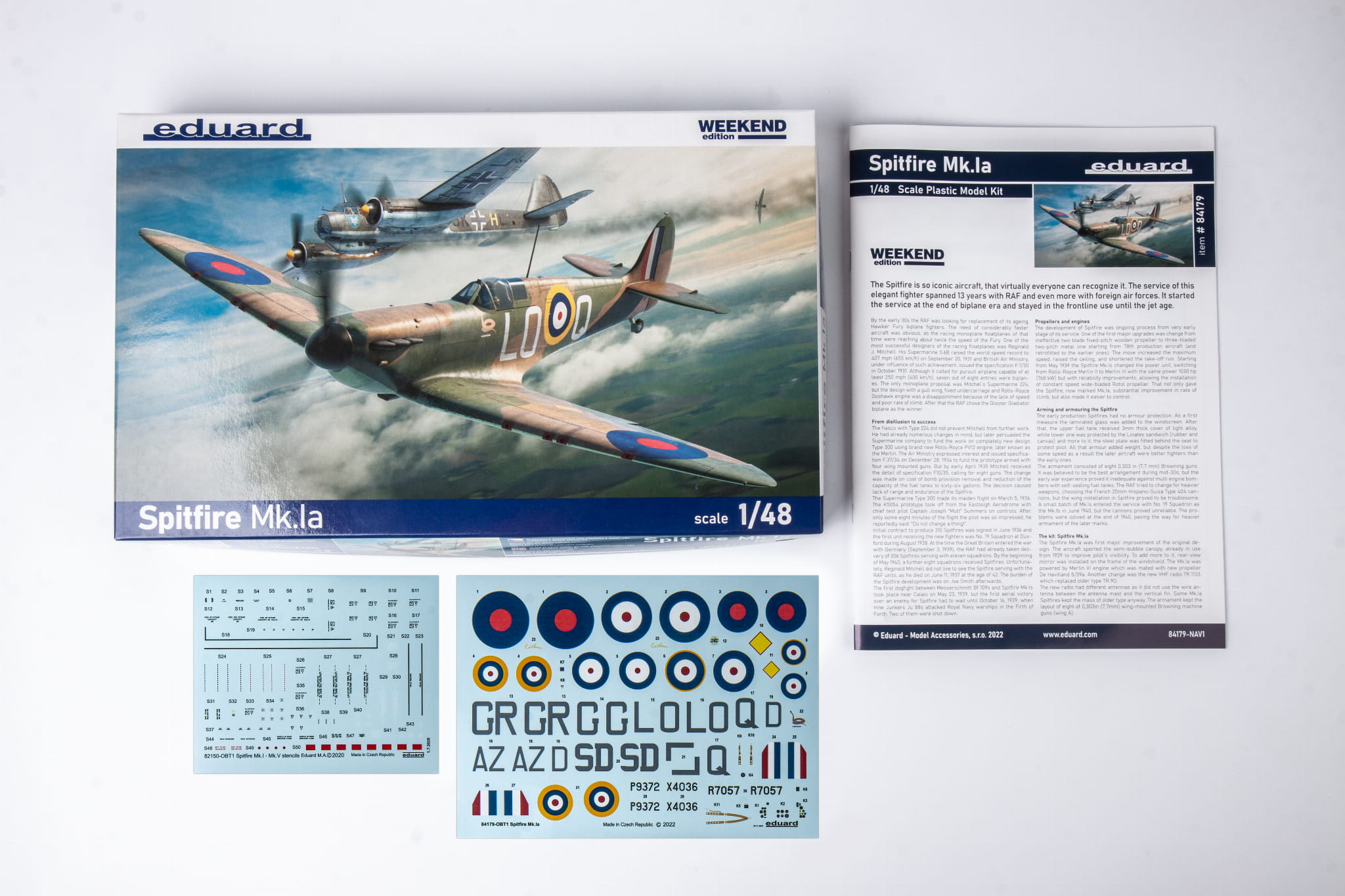 Weekendowy zestaw brytyjskiego jednosilnikowego myśliwca z czasów II wojny światowej Spitfire Mk.Ia w skali 1/48.części plastikowe: Eduardopcje znakowania: 4kalkomanie: EduardCzęści PE: niemaska do malowania: nieczęści z żywicy: nie